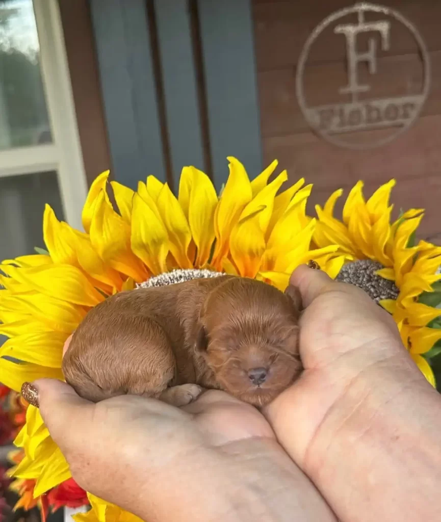 Daisy is a gorgeous Red Female Toy Maltipoo with a soft, hypoallergenic, non-shedding coat. She’s affectionate, playful, and full of personality — the perfect little companion for any loving home!